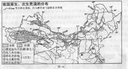 材料二我国原生、次生荒漠的分布图(图14)