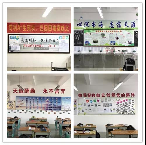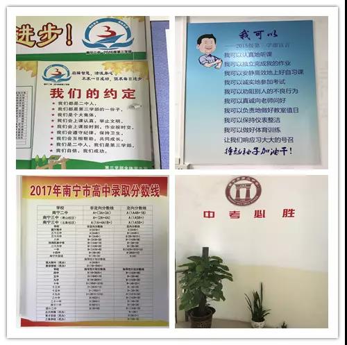 各学部各班在班级文化建设中还有许多独到的小设计,例如有些班级注重榜样的树立,有些班级对教室的储物柜进行了修饰,还有特色的诚信考试签名墙,还有些学部将南宁二中凤岭校区美景、世界地图、班规等元素运用到教室走廊的设计中,形成了一条条文化长廊。