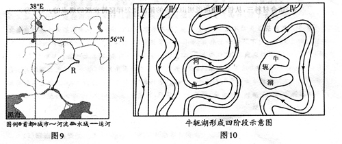 (2)据图10和材料分析R河两岸牛轭湖的形成过程。(14分)