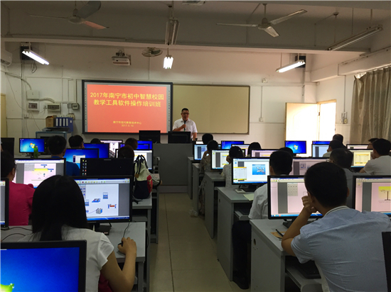 为进一步推动初中智慧校园教学工具软件的使用,更好地帮助广大教师有效运用于教育教学之中,5月10日,市现代教育技术中心举办2017年南宁市初中智慧校园教学工具软件操作培训班。培训对初中物理、化学、生物、数学四个学科教学平台的使用操作和教学设计开展实例讲解以及上机指导。培训为期两天,来自我市二中、四中、八中等近120名教师参加培训。