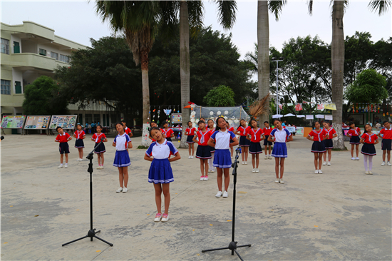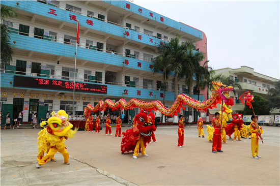活动由全校师生诵读《诵经典,壮国志》拉开序幕。接下来是武术健身操《旭日东升》环节,随着一声声“呼——!”“哈——!”,学生们用刚劲有力的动作,展示了中华“男儿当自强”的英雄气概。紧接着是各式各样的民族体育项目大课间活动,拋绣球、走板鞋、竹竿舞等吸引了很多来宾、老师们的眼球,他们和学生们跳起了欢快的竹竿舞。“咚,咚咚——”一阵节奏感强烈的鼓声响起,学校“六狮一龙”学生龙狮队出现在学校正德楼前操场,大家被鼓声吸引过来,目光随龙狮队的舞动而转动。锣鼓喧天的热闹后,依次还有悦耳动听的葫芦丝表演、英语歌曲歌谣、古典的古筝表演、笔酣墨饱的地书书法等社团才艺展示。除此之外,还有校本晨诵课和学生手工、作文、手抄报、书画等作品展示。